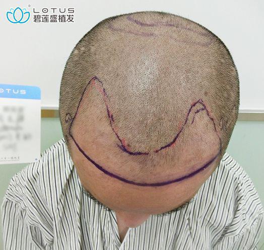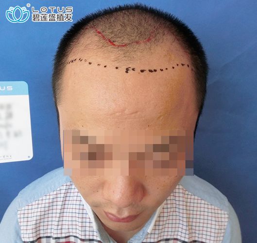 在闵先生可接受的费用范围内,只能移植2800毛囊单位。如此的大面的光秃与稀疏情况下,2800单位的体量是完全不够用的,这就更要合理地去分配种植。最终确定着重进行两侧额角和发际线的修复,头顶大面积稀疏的部位稍微加密。