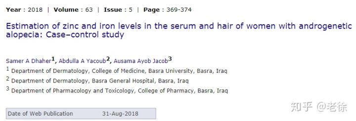 这篇研究的实验过程就到此为止了,不过在实验过程中,研究人员还发现了一个现象:AGA组头皮锌含量有区域差异,额叶区锌含量低于枕区。这与雄脱的范围正好相符。其他的相关文献并不是很多,还包含着很大一部分针对斑秃的研究,不过老张依然找到了一些有意义的内容,下面分享给大家。