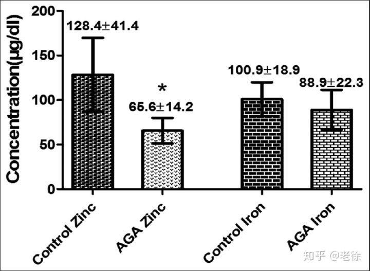 一篇于2013年11月发布的文献分别研究了斑秃(AA)、男性雄脱(MPHL)、女性雄脱(FPHL也叫FAGA)、休止期脱发(TE)四类患者血清中锌的水平: