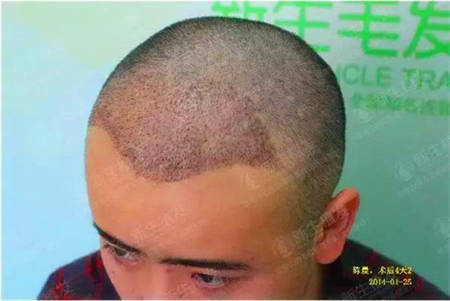 术后四天手术完成后的第四天。从后脑上移植过来的毛囊均匀的分布在额前的区域。血疤还没完全恢复,还可以看都一个一个红点一样的血疤。