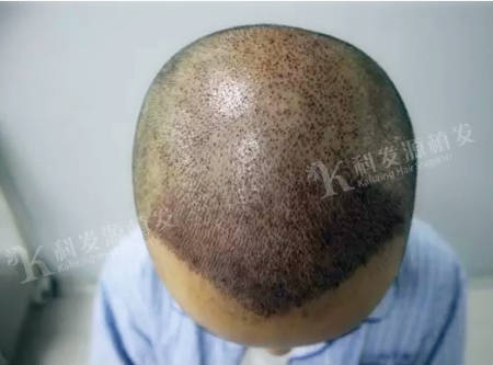 这是孙先生术后九天清理血痂后的照片,新植毛囊中的头发已经开始生长。黑毛茬密布在他的整个头顶