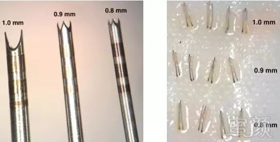 机器人的内针已经从原来的18G(1.0毫米),开始延展到19G(0.9毫米)和20G(0.8毫米),内径从1.0毫米移植缩小到0.8毫米,于是用小口径的针头提取,可以不做多余组织的分离,减少因为分离导致的二次损伤,也减少毛囊在体外的停留时间。