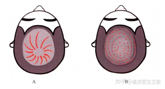如果是对头顶进行毛发移植,第一步就是找到发旋的中心,随着头发自然生长方向进行移植,移植头发的密度逐渐递增,或者密度一致。