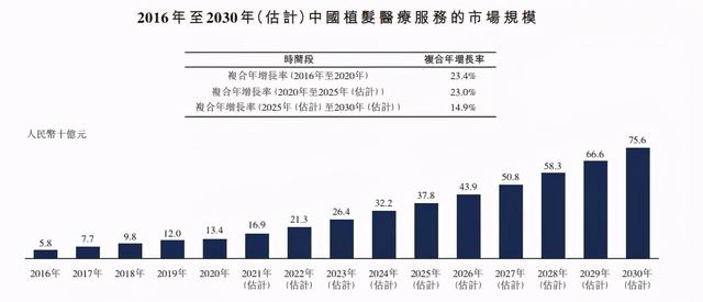 随着年轻群体对“油腻”厌恶的加深,植发逐渐获得社会认可。企业增长咨询公司弗若斯特沙利文的数据显示,截至2020年,中国植发医疗服务市场规模已达134亿元,并有望以18.9%的年均复合增长率在2030年突破756亿元。