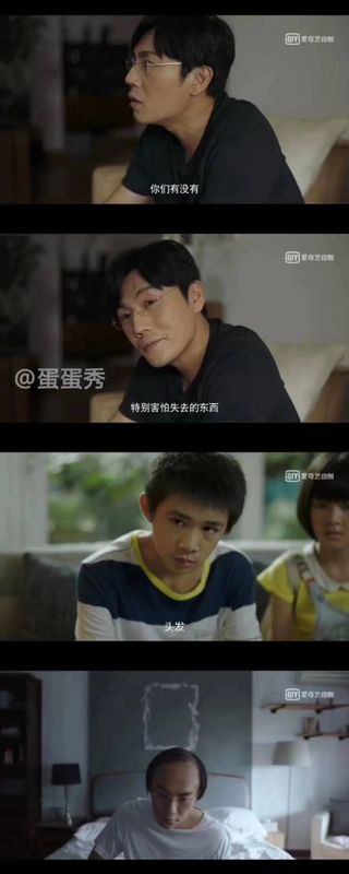 我们在剧里大部分时间看见的张东升都是头发正常的造型,也就是说,本就脱发并且已经有明显秃顶症状的张东升,一直在长时间的用假发片去遮盖头顶。还有一次在海边,警察老陈问张东升,“大夏天的戴帽子不嫌热么?”可以推断:张东升平时如果不戴假发片,就会戴帽子遮掩头顶。