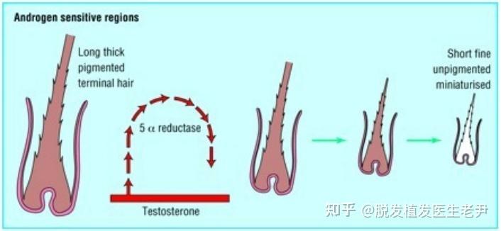 其原因是雄性激素会在Ⅱ型-5α还原酶的作用下,合成DHT,使毛囊的生长周期缩短,导致毛囊提前萎缩退化,直至脱发。