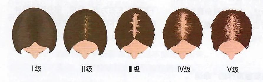 Ⅰ级(轻度):头顶部毛发弥漫性稀少、变细,稍有头皮暴露。