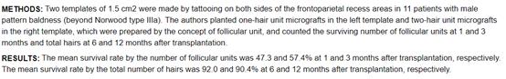 在两侧额角1.5cm2的区域内,1~3个月时,毛囊的成活率分别为47.3%和57.4%,在6~12个月时,毛囊的成活率分别为92%和90.4%。文献中没有透露种植的密度。