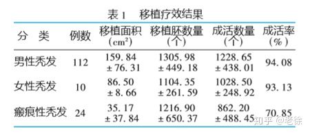 男女雄脱的成活率分别是99.16%和98.60%,移植总成活率达到了98.92%,令人意外的是,疤痕性植发的成活率达到了98.77%和99.24%,这在以往的研究中是基本见不到的数字。