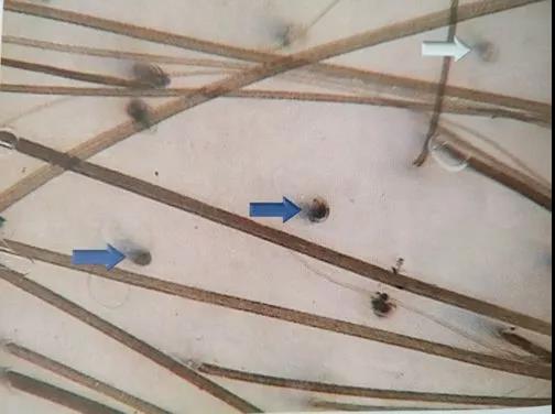 蓝色箭头所示的是黑点征在头皮表面时所展现的样子,可以理解为断发。实际上白色箭头所指的才是临床中较常见的黑点征的样子,被表皮覆盖住,像一个“黑qiāo”。