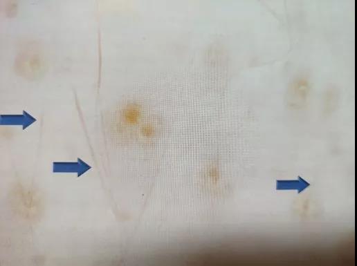图为恢复期的毛发表现型,图中可见黄点征,以及蓝色箭头所指的恢复期细短毳毛,一般可根据毳毛的生长情况判断斑秃的恢复进程。
