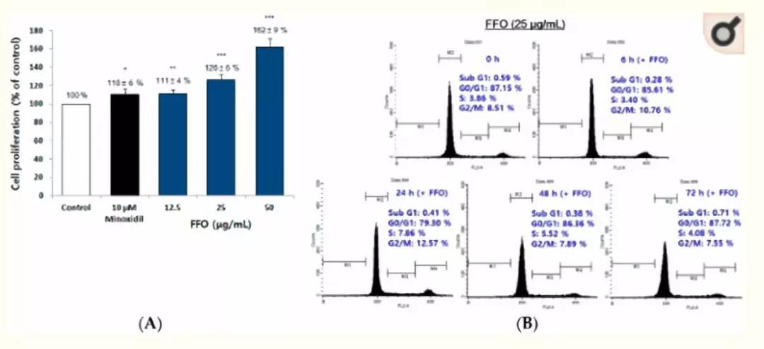 在得出FFO提取物确实对毛发的生长具有促进作用之后,研究人员进一步针对“FFO提取物的生发作用是否是能使DPC增殖引起的”这一问题进行了研究,依然选择了米诺地尔作为对照组,实验结果表明:FFO确实可以促进DPC的增殖从而达到生发的目的。
