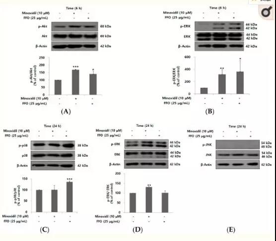 之前的试验证明米诺地尔对于DPC的增殖作用与Akt信号蛋白激活有关,研究人员也就此进行了FFO对一干磷脂磷酸激活作用的研究。