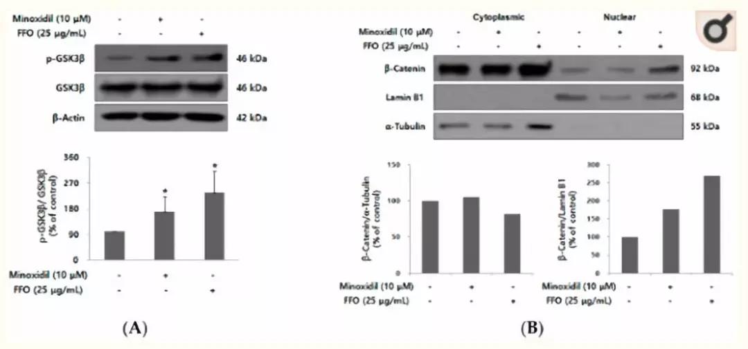 wnt/β-catenin信号通路的激活在毛囊再生和维持毛囊周期中起着重要作用。在此项研究中,FFO也没让我们失望,实验结果表明FFO提取物可能通过β-catenin的核转运,通过使GSK 3β失活而促进DPC的增殖。
