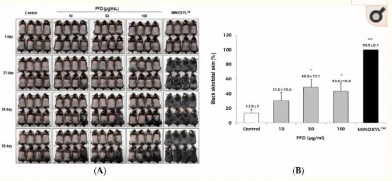 但到了体内毛发生长研究阶段,FFO相对与米诺地尔的效果就差强人意了,在不同浓度的FFO提取物,与自然生长,和米诺地尔之间的体内对比之中,虽然能看出FFO组对毛发有着相当明显的促进作用,但在米诺地尔几乎百分百的恢复率面前还是有点不够看。