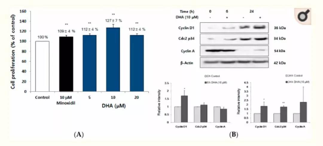 试验的最后,研究人员对试验体的另一种成分:二十二碳六烯酸(DHA)进行了研究,和米诺地尔做对照,结论依然是可以诱导DPC细胞的增殖,促进毛发而定生长。