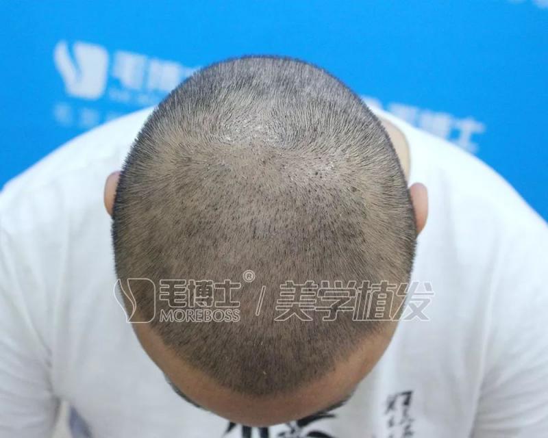 植发7天后,脱发情况已经明显改善,原本稀稀疏疏头顶已经重新长出头发,再也找不到脱发的痕迹,并且种植区毛囊排列紧密、密度自然,已经很好的生长,这主要是因为术前方案的完美设计和分布区域的合理与过渡区的无痕衔接。
