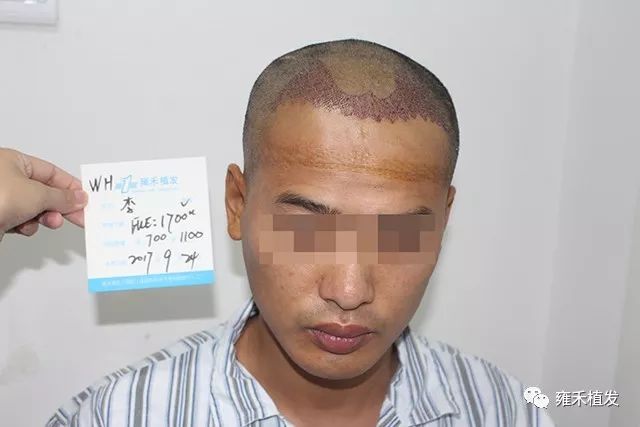 2017年9月24日,武汉雍禾采用FUE-APL2.0为李先生种植1800单位,含单根头发的毛囊单位700,含多根头发的毛囊单位1100,本来术前预估种植1700,结果多取种100。说一下手术时间吧,11点40进手术室,14点40出手术室,总计3小时。这个时间段也就是午休时间吧,李先生算是趁着一个午休就做了植发。