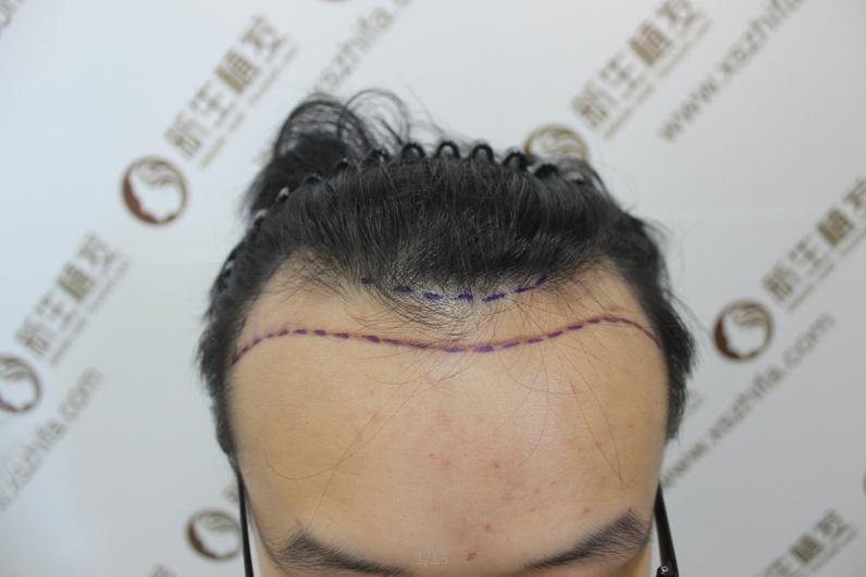 术前,朱先生发际线比正常人高出很多,新生形象设计师为他设计了合适的发际线种植方案,预计移植毛囊3000单位。