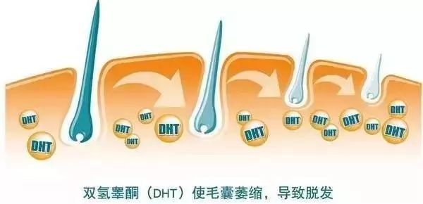 脱发的发生,主要是因为毛囊带有脱发基因,受到双氢睾酮(DHT)刺激影响,毛囊失去活性,毛发变细软、易脱落,形成脱发。