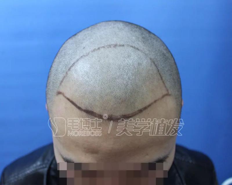 在经过毛囊检测之后,医生为陈先生进行艺术画线,画线区域根据其额角和发际线需要种植的单位进行规范布局。最终决定采用FHT技术种植2850毛囊单位的植发方案。