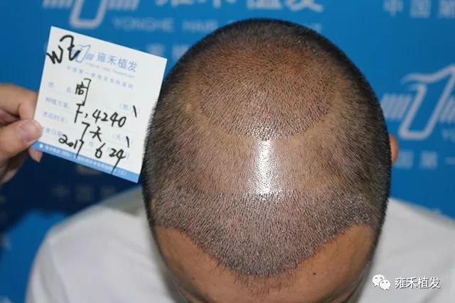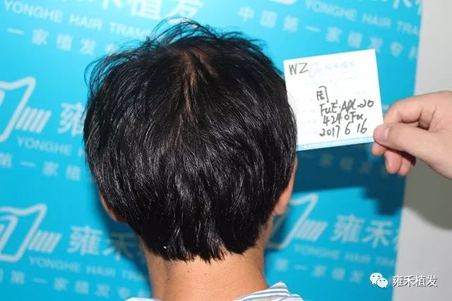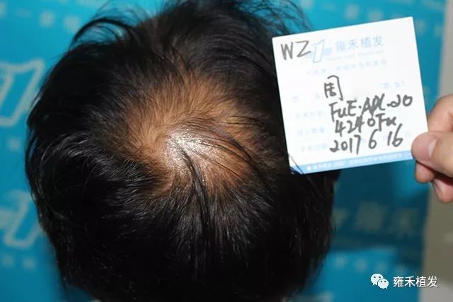 医生给他讲解植发,并拿出效果图,还有一些真人效果,慢慢地,周先生对植发信赖有加,果断预定了植发手术。那么大的脱发面,还有救吗?应该有救的,周先生豁出去了。2017年6月16日,温州雍禾采用FUE-APL2.0为周先生种植4300单位,含单根头发的毛囊单位2600,含多根头发的毛囊单位1700,本来术前预估种植4240,结果多取种60单位。只要是超4000单位就是大面积植发,足以说明周先生秃的严重。