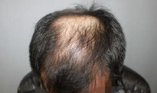 前额明显秃发,额中部发际后退,头顶部脱发,一束浓密的头发将这两个区域分开,整体头顶部位稀疏,但是头发没有完全脱落,还有一些细软的头发存在。