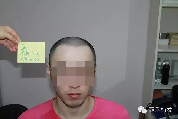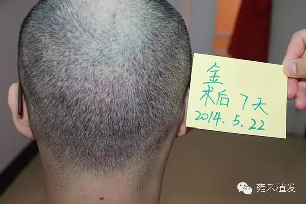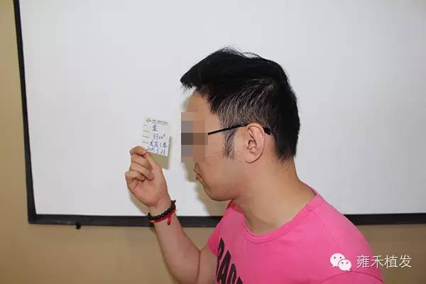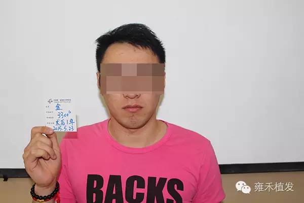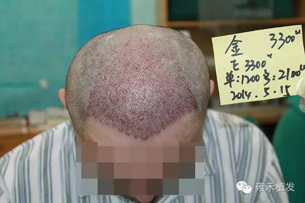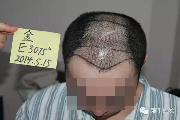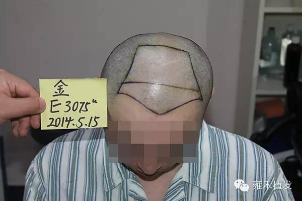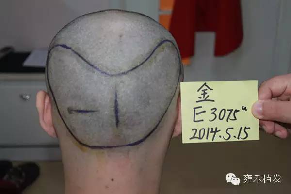 2014年5月15日,金先生来到上海雍禾植发医院,本来预计用FUE-APL2.0取种3075毛囊单位,结果是取种3300毛囊单位,就毛囊单位所含头发根数来说,单根的1200单位,多根的2100单位。一毛囊单位平均含2根头发,3300单位大致是6000根头发,相当于6000颗“黑色的树”。也可以说是“绿色的树”,这里的“黑”和“绿”都是褒义,同义。