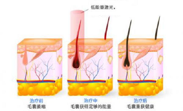 半导体激光治疗雄激素性秃发,显示低能量激光可赋予萎缩毛囊以新生活力,增加毛发密度,联合口服非那雄胺片,疗效更佳。这种低能量软激光治疗脱发的方法,也被证实是一种高效、安全的防脱发的治疗方法。