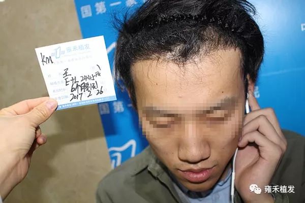 (术后当天的种植区,有血痂,正常。注意,上面头发扎起来了,一松开足以覆盖前面的种植区,从正面看别人是看不出来植发的样子的。)