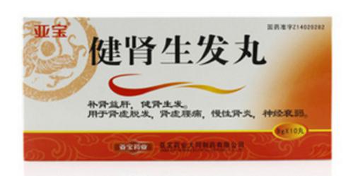 健肾生发丸(亚宝尔宁)为棕黑色的大蜜丸;气香,味甘、酸、苦。主要成份为制何首乌、熟地黄、枸杞子、黄精、五味子、大枣、女贞子(酒制)、菟丝子等。具有补肾益肝,健肾生发的作用。用于肾虚脱发,肾虚腰痛,慢性肾炎,神经衰弱。
