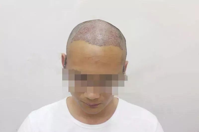 这是何先生术后一天的效果图。种植了2500个单位的毛囊后,血痂还残存在手术区,经过医护人员的术后清理后会慢慢的变干净。