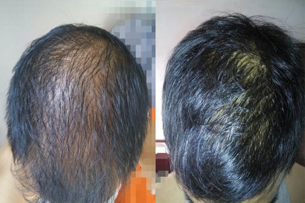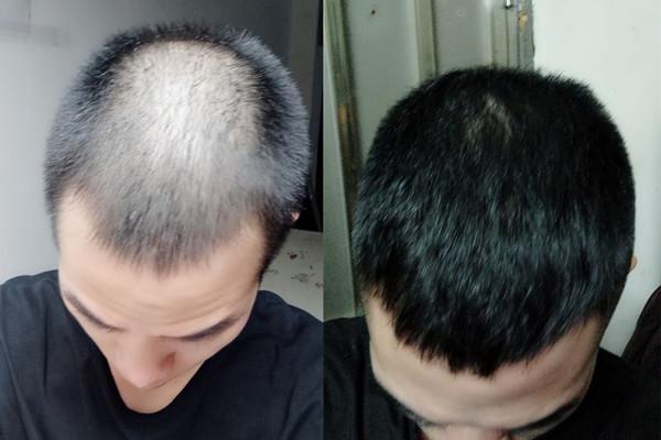 第二个要分享的案例是下图中的发友,可以看出他在治疗前头顶很稀疏,隐约可见头皮,他表示自己的脱发是突然出现的,洗个头水盆里全是掉下来的头发,目测得有200多根。自此之后,这位发友的头发开始变得细软和油腻,做梦都是在掉发,心理焦虑不已。在采取了理疗和中药治疗后,期望都落空了,后来去医院检查后才知道是雄脱,得知非那雄胺的副作用后不太敢用,便采取锯棕榈搭配米诺地尔凝胶的方法,半年后头发长了出来,发质也变硬了。