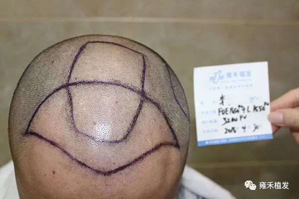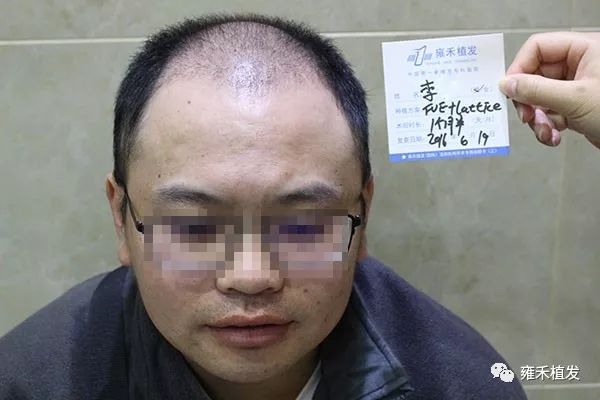 这就是昆明李先生的脱发现状,一个是横着的椭圆,一个是竖着的椭圆,彼此交错一起横亘在头顶,好比是两座山当头重压。对了,由于工作人员疏忽,他术前有头发的照片没有拍上,如果术前较长头发,两个交错的椭圆是不大看得明白的,即使看得着也是模糊的轮廓,而理了头发就非常明显的脱发轮廓。横着的椭圆两端就是发际线后退,中间是稀疏,而竖着的椭圆全是稀疏状——直白地说吧,李先生是脱发的空白区和脱发的稀疏区交叉。