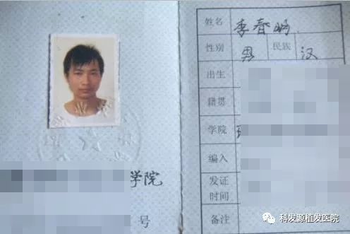 ▲大三时的李春明,脱发更严重,发际线和前额头顶头发稀疏