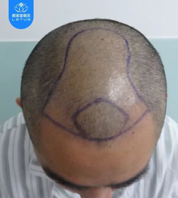 经过毛囊检测,最终的手术方案是:头顶脱发区整体加密 额角填充及发际线修复。另外程先生前核心区域的那一小块的毛发密度还可以,我们建议不用加密,这样一来,可以为程先生省下一部分植发费用。同时,头顶加密区域,需要术后配合用药,以防止原生发的继续退化。