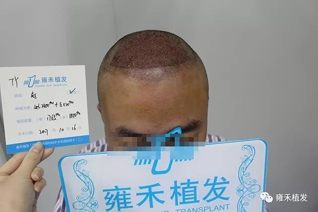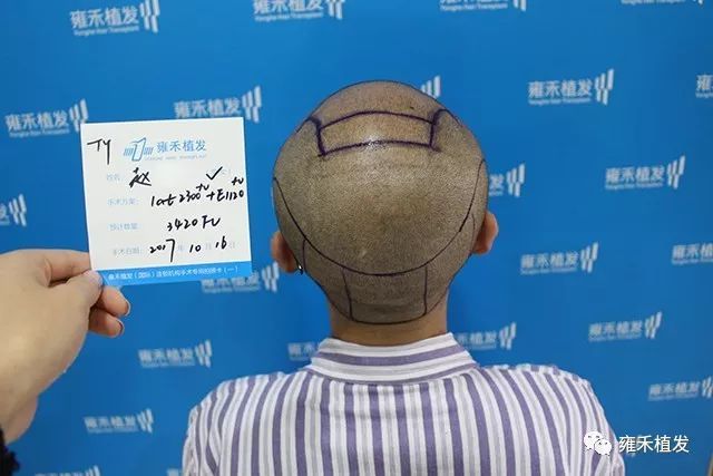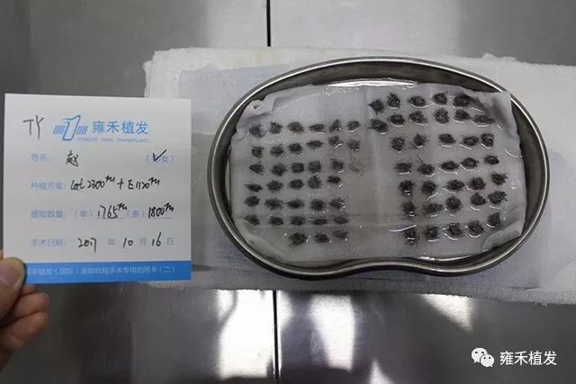 几个月之后,小赵终于考试完毕,并且这个时候头发不掉了,是脱发稳定期,于是他果断走进太原雍禾植发。2017年10月16日,太原雍禾为小赵植发3565单位,其中单根头发的毛囊单位1765,多根头发的毛囊单位1800,本来术前预估种植3420单位,实际上多取种145单位。前面说了,小赵的脱发属整体性稀疏,因此在技术选择上以LATTICE为主FUE-APL2.0为辅,二者的种植量之比大概是2比1。