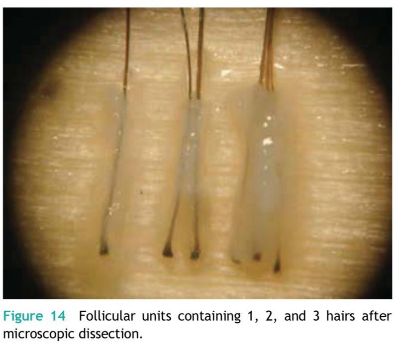 每株毛囊单位不一定只含一根头发,有时会有2-3根Photo Credit:Follicular Unit Hair Transplantation: Current Technique, Actas Dermosi liogr. 2010;101(4):291–306
