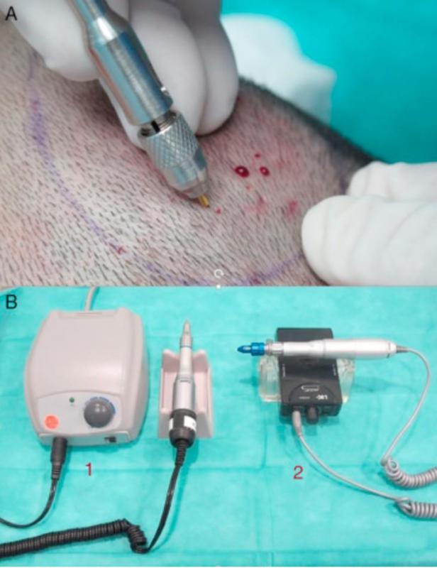 FUE手术使用钻发器械钻取毛囊photo credit: Follicular Unit Extraction for Hair Transplantation: An Update, ACTAS July–August 2017, Pages 532-537