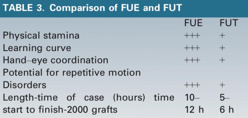 文献中认为,FUE 钻发所需要的体力远大于FUT 切头皮。另外FUE 的学习曲线也比FUT 困难,毕竟能准确钻取到完整的毛囊,绝对要比把头皮切好一株一株分来的困难。另外FUE 手术也需要比FUT 更好的手眼协调性,而这也同时伴随了对医师来说重复动作造成的职业伤害…最后文献提到FUE 手术通常比FUT 手术时间长大约1 倍,但实际上熟练的团队可以把时间差距缩到更短。