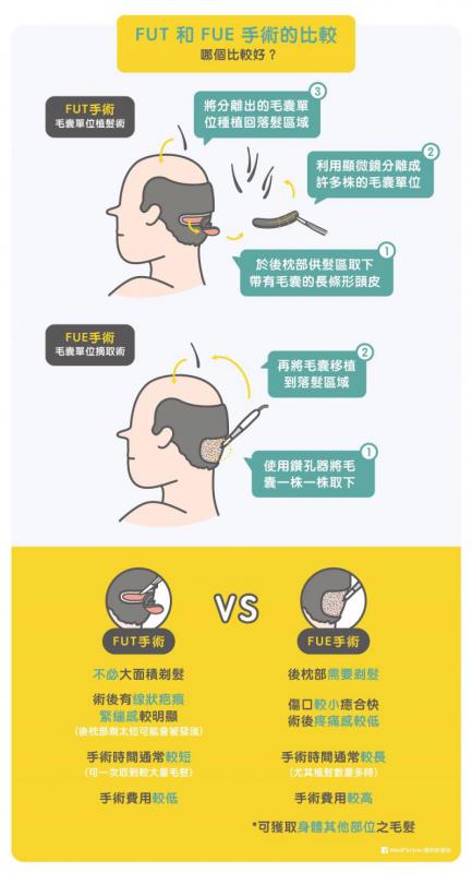 FUT 跟FUE 这两种手术并没有哪一种手术较好,端看整个植发团队对于哪一种手术熟练度高,以及病人本身的条件或是需求来决定。一般而言无法接受后枕部剃发、需要数量较多(一般是5000 根头发以上)、预算有限时,会建议采取FUT手术;相反的,如果无法接受后枕部的线状疤痕、未来后枕部发型可能剃很短、或是希望手术伤口较小,则会建议FUE手术,但手术费用会比FUT高。