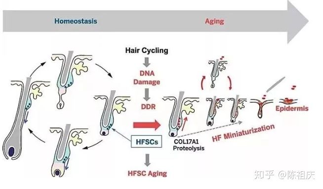 在毛发周期中毛囊干细胞如果收到衰老刺激,就会完成自己生命周期,分化为表皮角质,从皮肤表面清除。