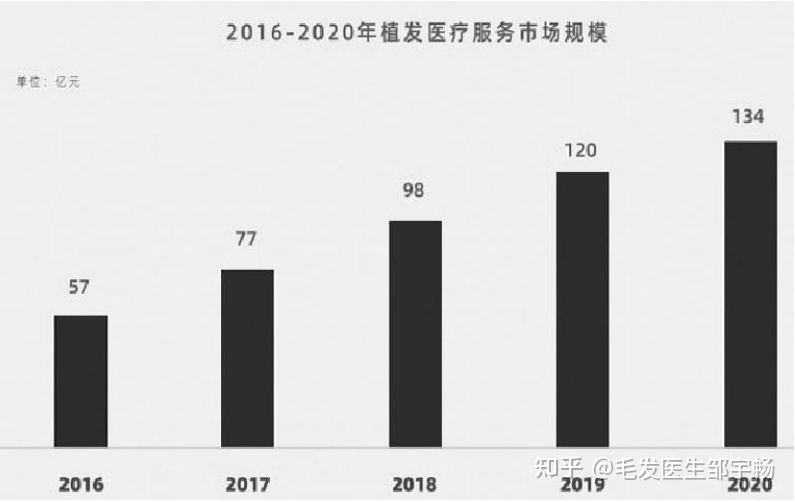 近年来脱发人数不断增加,需求刺激了相关市场规模的发展,下图为《2021 中国植发行业报告》所给出数据。