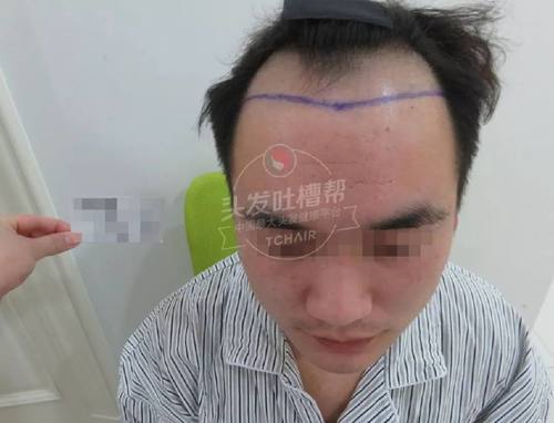 在确定植发手术后,我和医生们根据小赵的面部比例为他进行了特殊的艺术设计画线,我们确定了他的植发区域,针对他的颞角部位及前额发际部位进行了精确地毛囊单位计算。