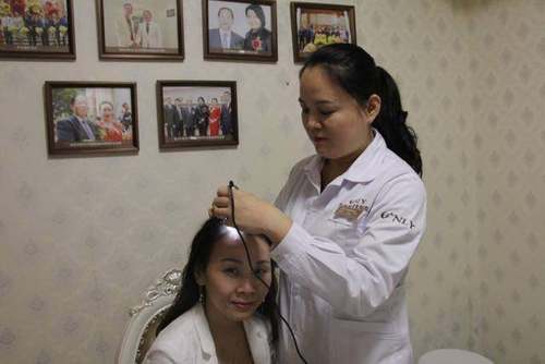 越女士告诉植发医生自己非常怕疼,为了减轻打麻药时的痛楚廖主任用冰冷敷之后再加上小型按摩器慢慢的注射麻药