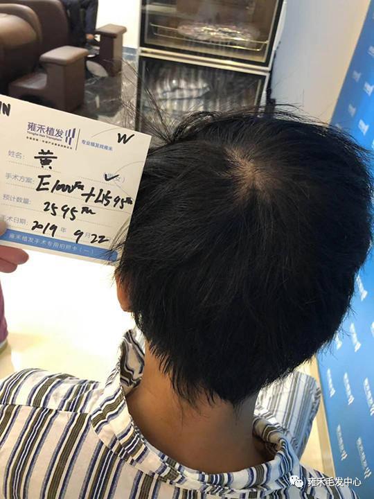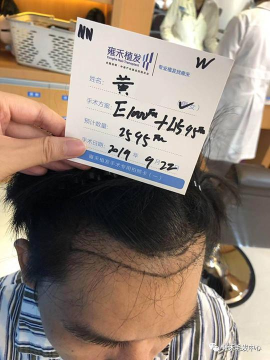 2019年9月22日,黄先生在南宁雍禾第三次植发,种植2595单位,一个是加密头旋跟前,一个是种植原来发际往上两指宽的空白部分,这么一种整个秃区就是算是全种。