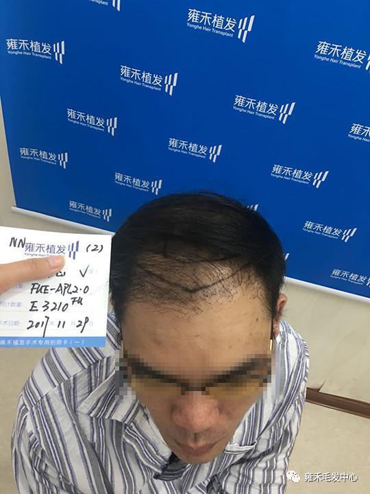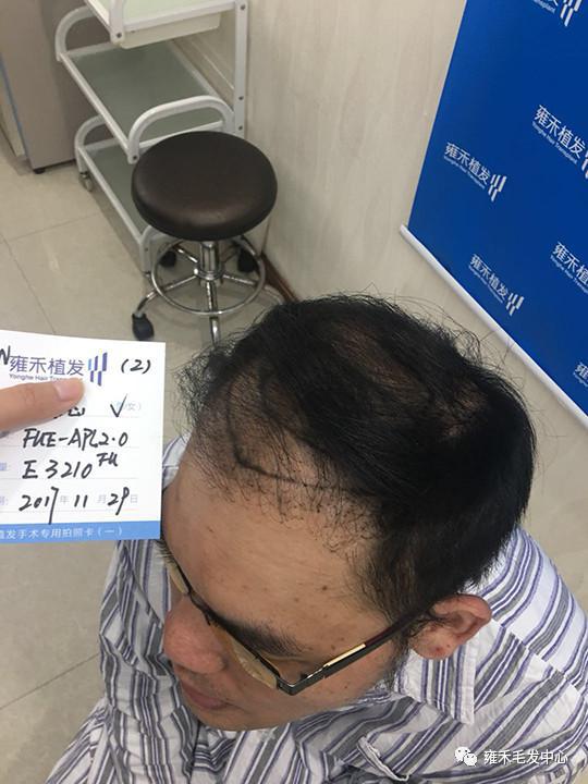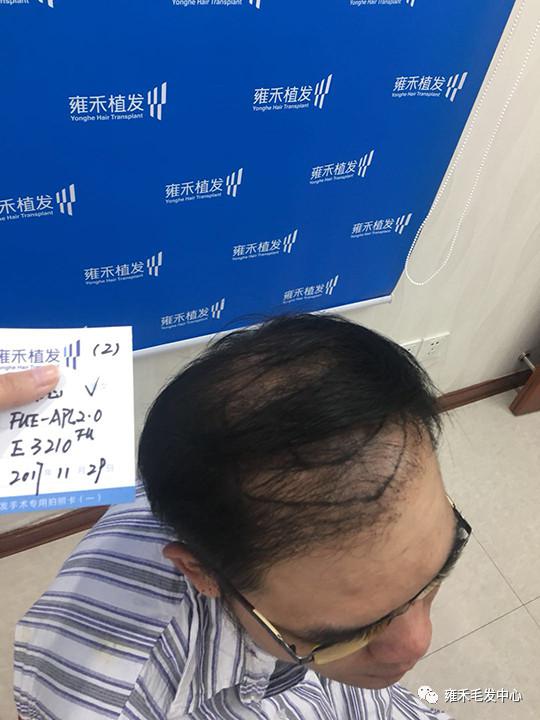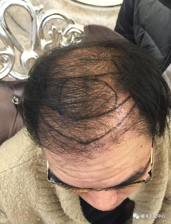 2017年11月29日,他第一次来南宁雍禾植发,呈现出的是一幅邋遢形象,发际往上一巴掌宽是稀疏的裸露头皮,再往上一巴掌宽是黑头发,再往上一巴掌宽到头旋跟前是裸露头皮,怎么头顶两端秃了中间有绺黑头发?
