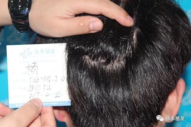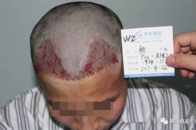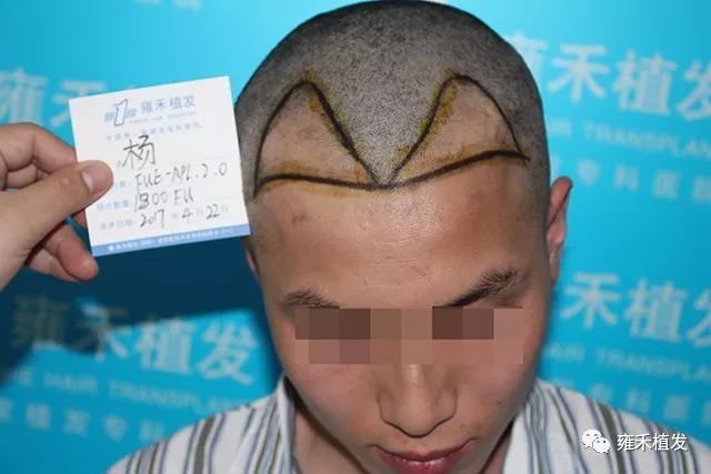 2017年4月22日,也就是在晚饭之后,他走进温州雍禾的手术室,医护团队采用FUE为小杨植发2090单位,含单根头发的毛囊单位914,含多根头发的毛囊单位1176,本来术前预估种植1800单位,结果多取种290单位。手术是从晚上7点半开始,一直到11点半结束,总计4个小时,这段时间正好是夜色,可谓是冒夜植发。
