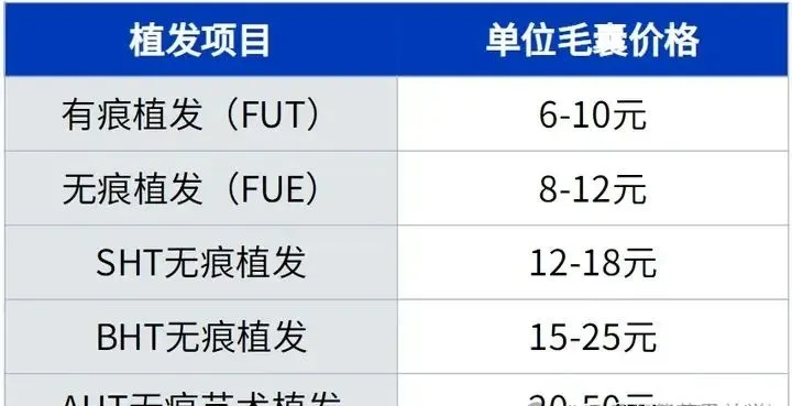 (2)无痕植发FUE/SHT/AHT/BHT:12-50元/单位毛囊