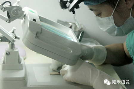 (往孔里种头发。两个种植师保证了种植速度,同时确保自然度。)